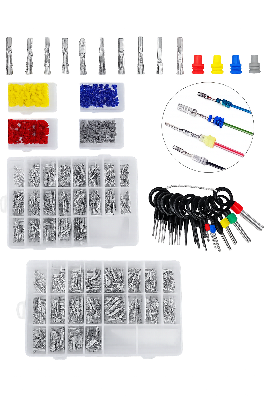It includes a wide variety of terminal pins, colored rubber seals, and a terminal removal tool set, making it ideal for professional workshops and advanced DIY users.